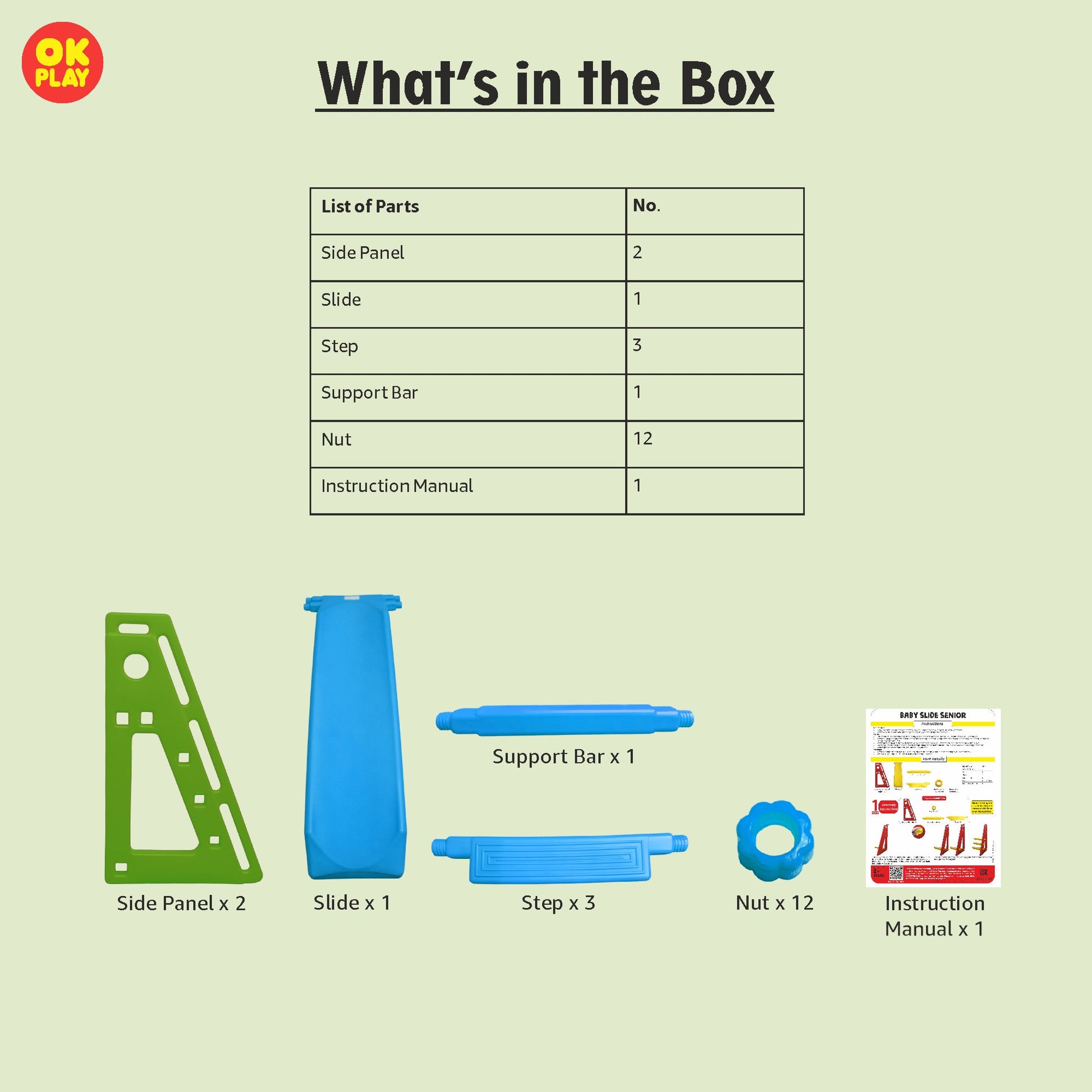 The OK PLAY Baby Slide Senior is a perfect addition to any play area, offering endless fun for children aged 2 years and above. Designed for both indoor and outdoor use, this slide is ideal for homes, gardens, schools, and playgrounds. Made from durable, weather-resistant, and non-toxic plastic, it ensures long-lasting safety and enjoyment. The anti-skid steps and smooth edges provide a secure climbing and sliding experience, while the lightweight design allows for easy portability. Quick and hassle-free to assemble, this slide is a great way to encourage active play, balance, and motor skill development. With its vibrant yellow and blue color combination, it adds a fun and cheerful touch to any space.