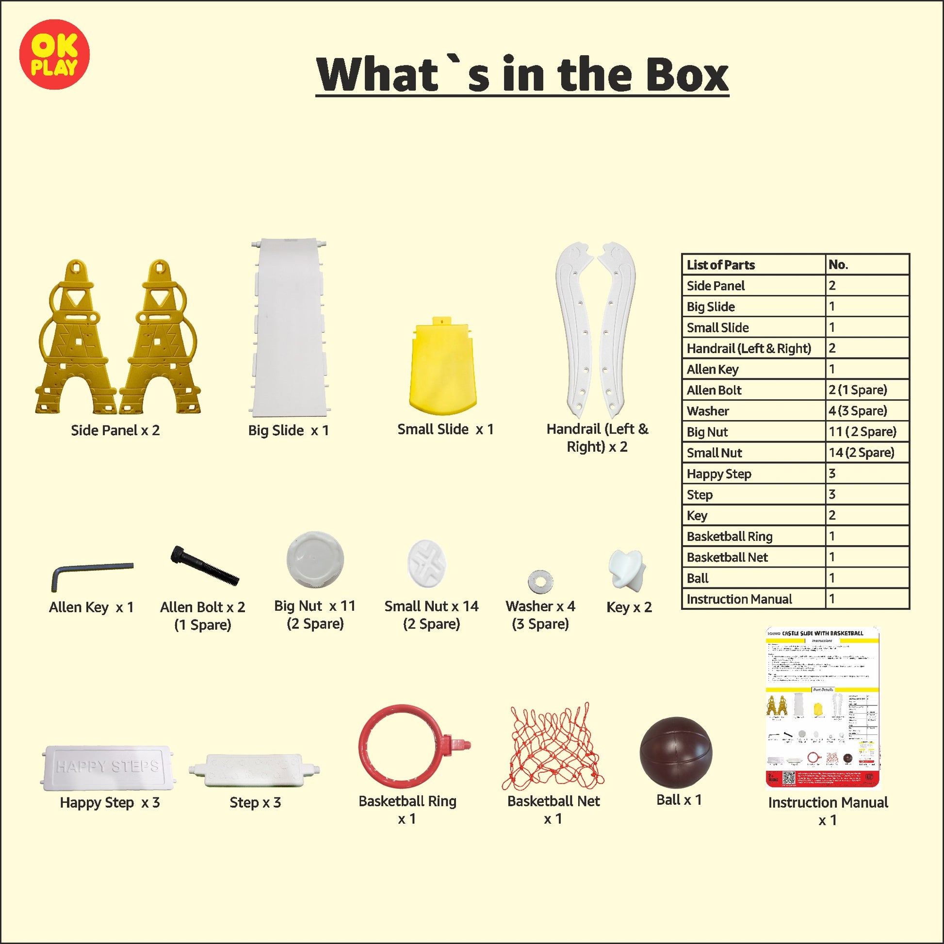 The OK PLAY Castle Slide with Basketball Ring is designed for endless fun while ensuring complete safety and convenience. With a spacious sliding surface, kids can enjoy a smooth and exciting ride, while the anti-skid steps and easy-grip handles provide a secure and comfortable climb. Made from durable, weather-resistant, and non-toxic plastic, this playset is perfect for both indoor and outdoor use. The attached basketball ring with a ball adds extra excitement, promoting active play and motor skill development. Plus, it’s easy to assemble—all necessary parts are included in the box along with a detailed instruction manual, making setup hassle-free. Bring home this 2-in-1 playset and let your little one slide, shoot, and play with confidence.