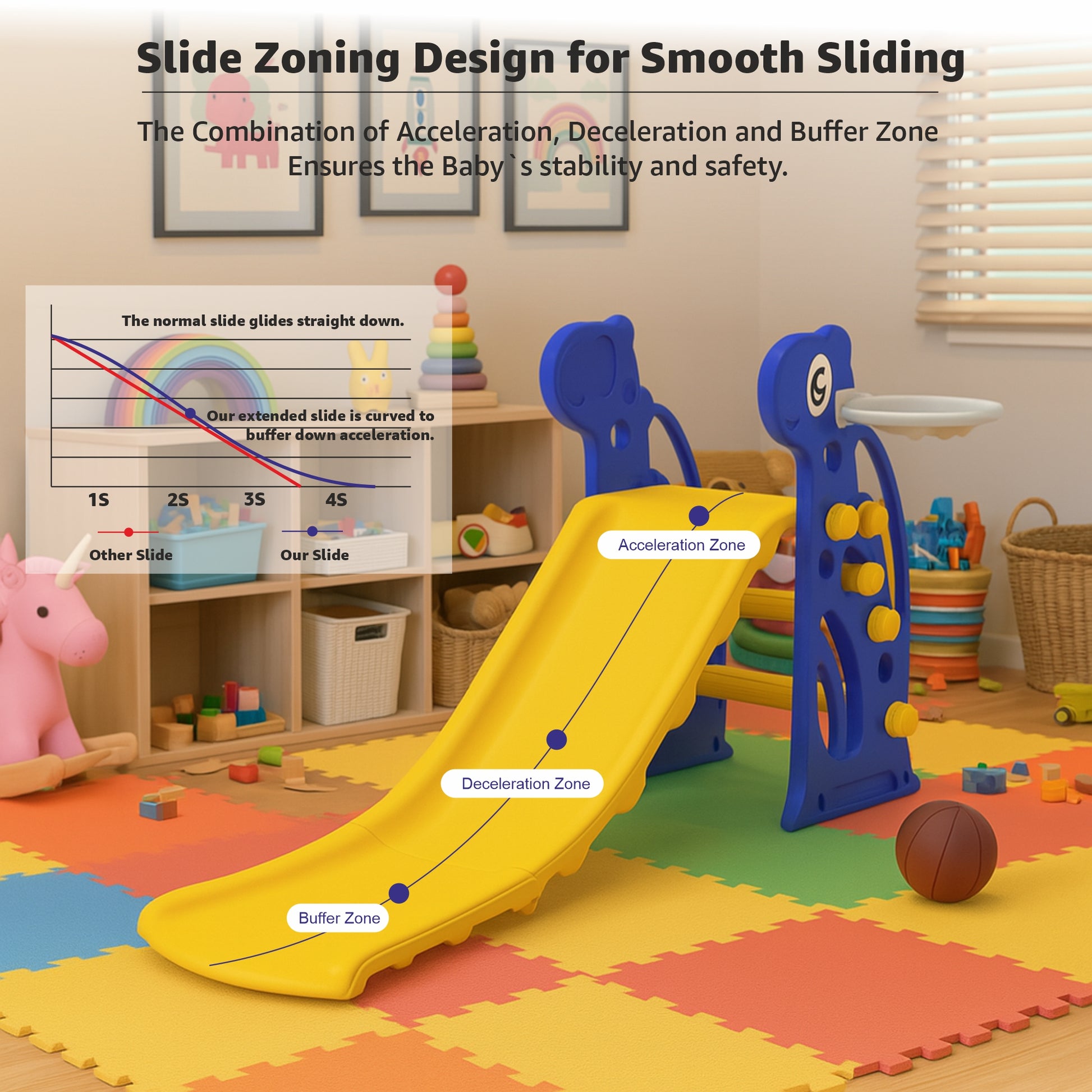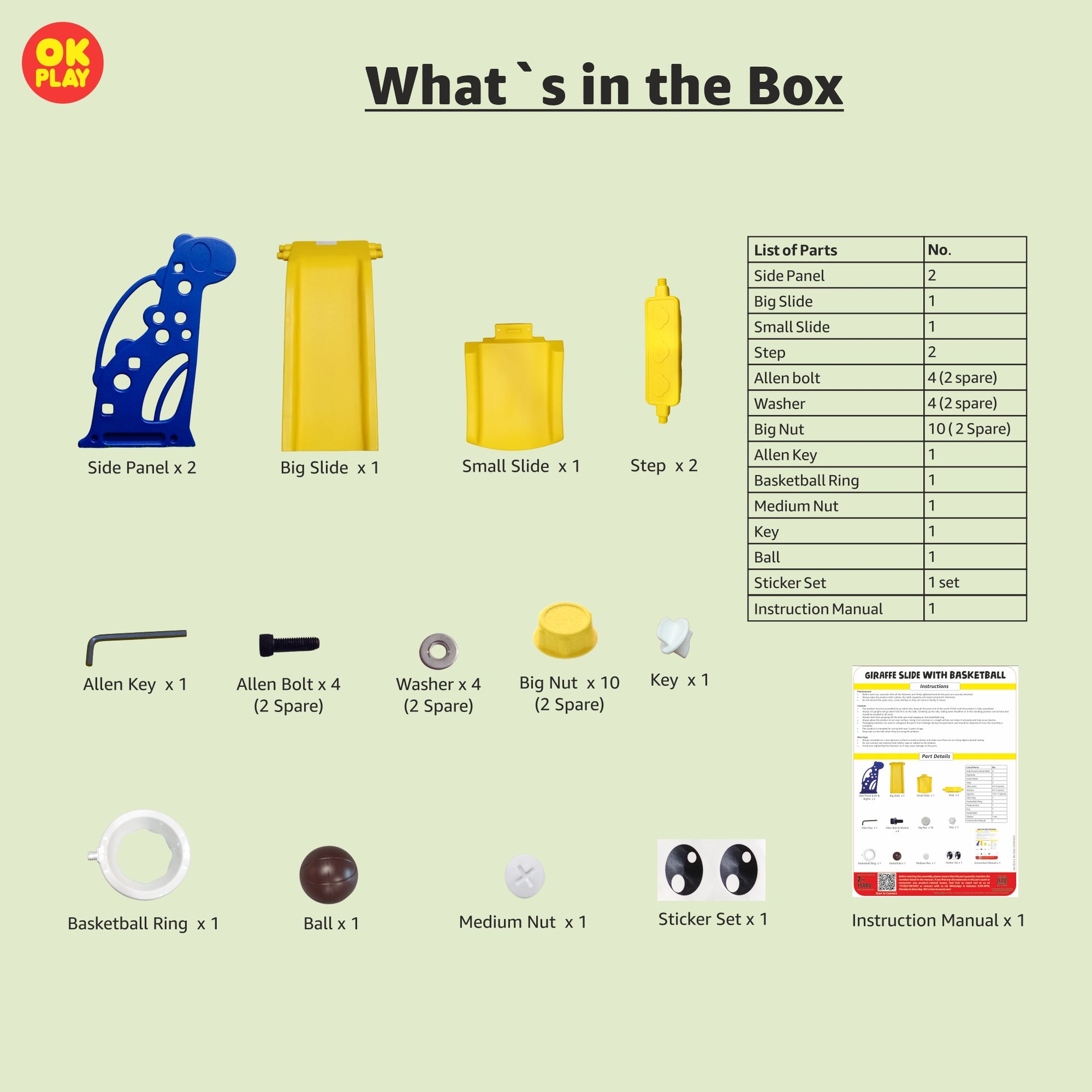 The OK PLAY Giraffe Slide with Basketball Ring is designed for endless fun while ensuring complete safety and convenience. With a spacious sliding surface, kids can enjoy a smooth and exciting ride, while the anti-skid steps and easy-grip handles provide a secure and comfortable climb. Made from durable, weather-resistant, and non-toxic plastic, this playset is perfect for both indoor and outdoor use. The attached basketball ring with a ball adds extra excitement, promoting active play and motor skill development. Plus, it’s easy to assemble—all necessary parts are included in the box along with a detailed instruction manual, making setup hassle-free. Bring home this 2-in-1 playset and let your little one slide, shoot, and play with confidence.