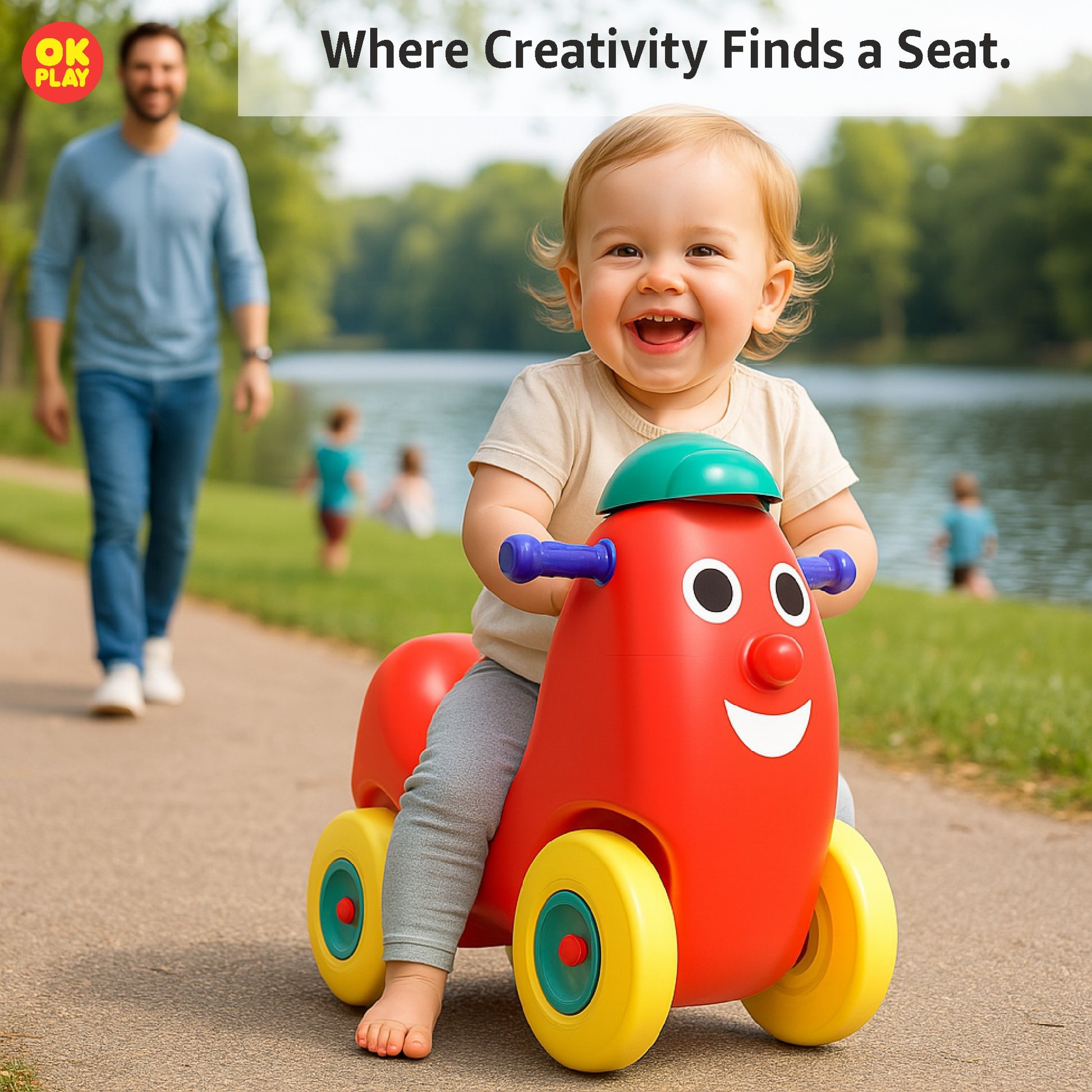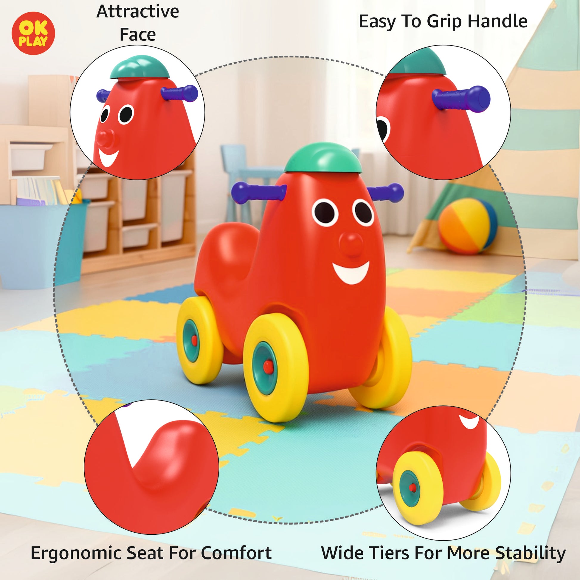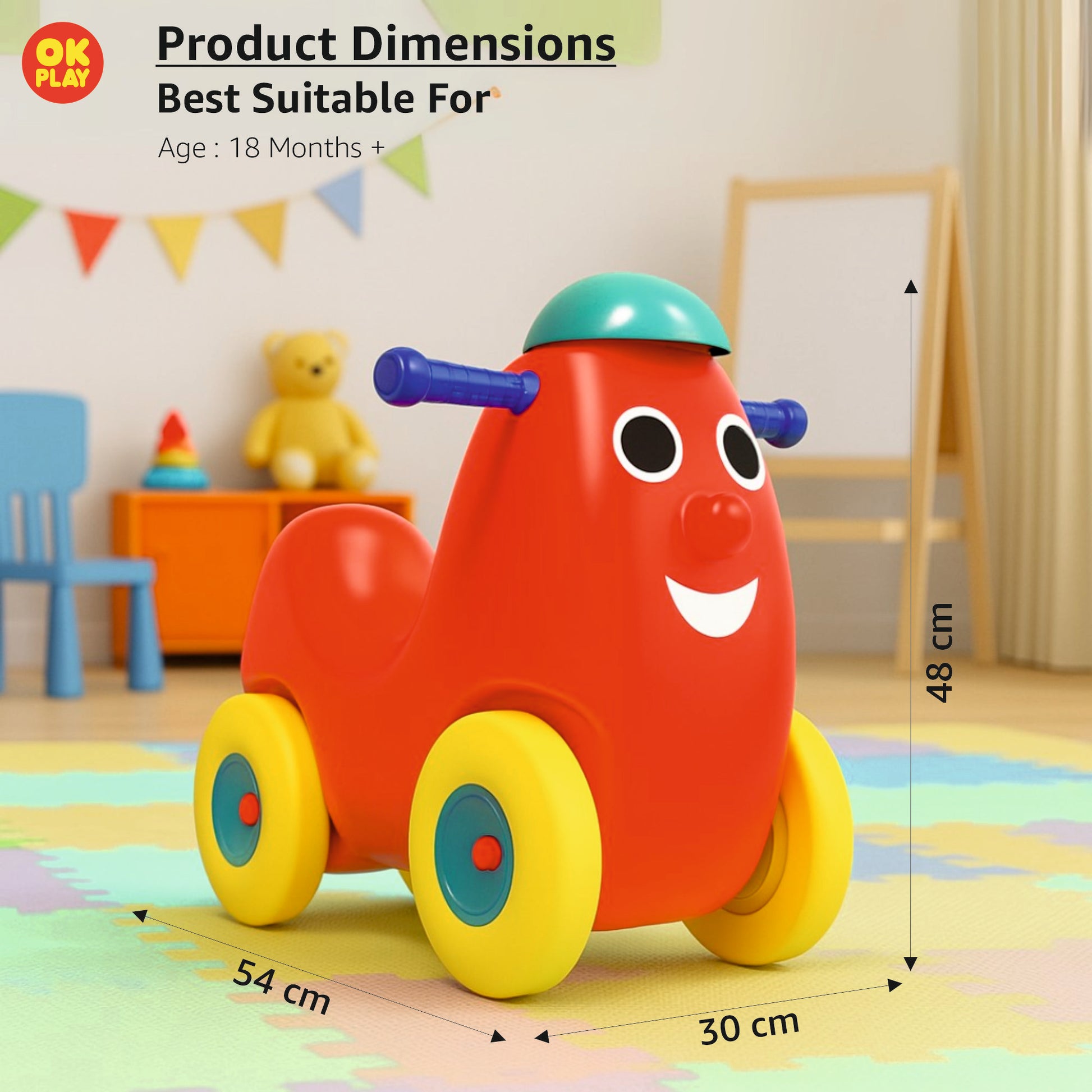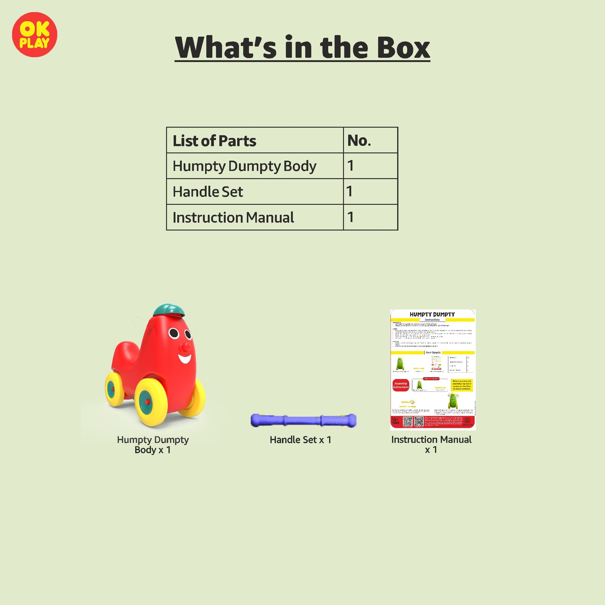 The OK Play Humpty Dumpty Ride-On is a fun and engaging push-and-ride toy designed to enhance a child's motor skills, balance, and coordination. Crafted from high-quality, non-toxic, and durable plastic, this ride-on is built to withstand hours of play while ensuring maximum safety for young riders.Shaped like the beloved nursery rhyme character Humpty Dumpty, this ride-on features an ergonomic design with a wide and sturdy seat, allowing toddlers to enjoy a comfortable ride. The easy-grip handlebars and smooth-rolling wheels enable effortless movement, helping children develop confidence in mobility.Designed for kids aged 1.5 years and above, the Humpty Dumpty Ride-On is lightweight yet stable, making it ideal for both indoor and outdoor play. Its bright and cheerful color combination adds to its appeal, making it a delightful companion for your child’s playtime adventures.Encouraging active play and independent movement, the OK Play Humpty Dumpty Ride-On is perfect for toddlers who are learning to push, balance, and ride while having endless fun.
