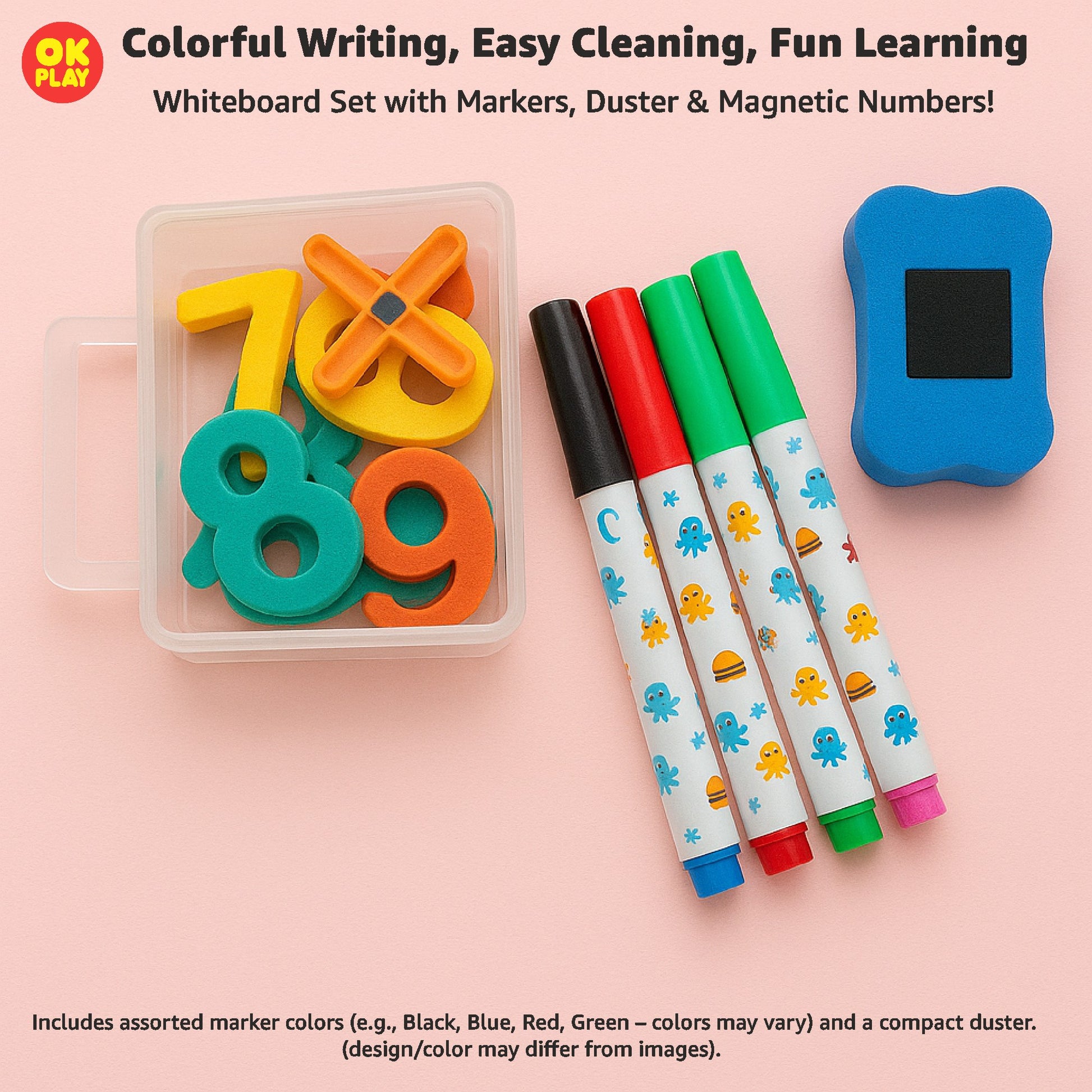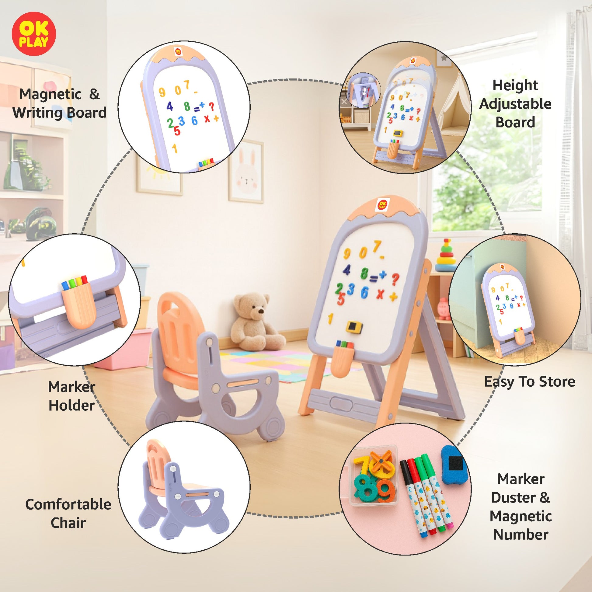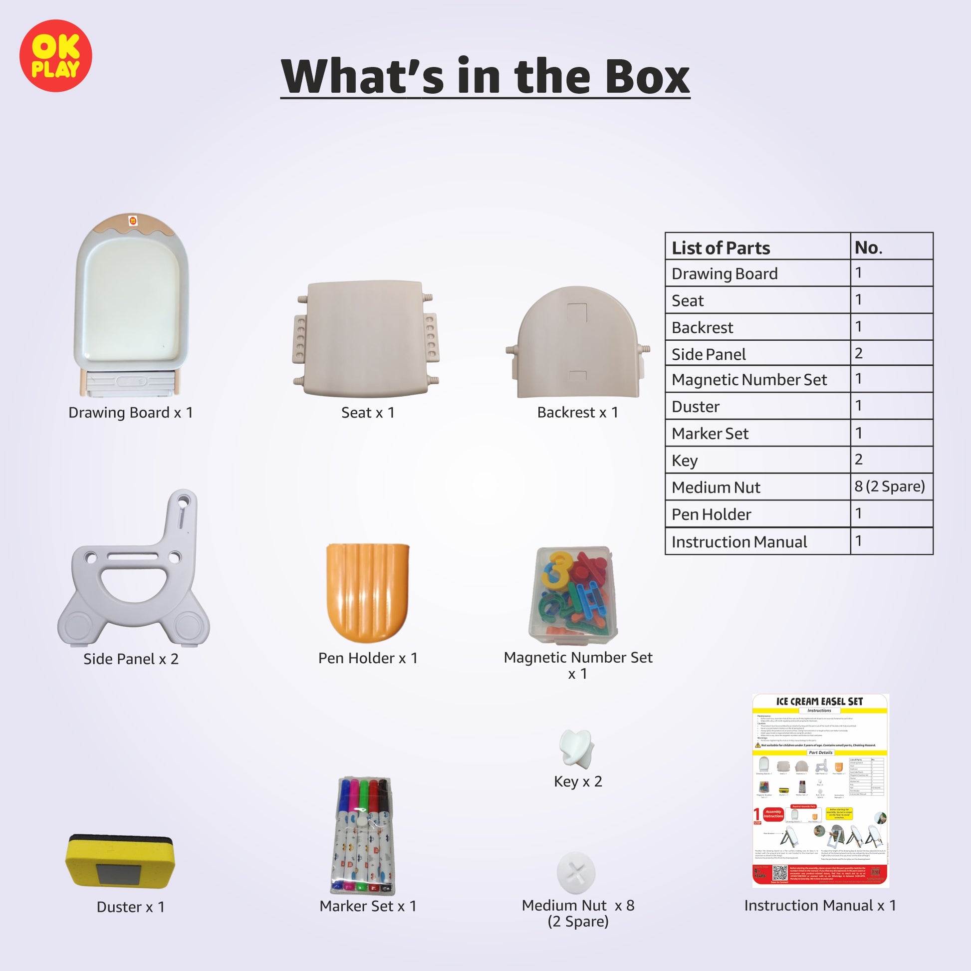 OK PLAY Ice Cream Easel for Kids |With Chair | Drawing Board | Magnetic Whiteboard with Numbers | Markers | Duster | Storage Box | Adjustable Height | Portable | Fordable | Perfect Gift