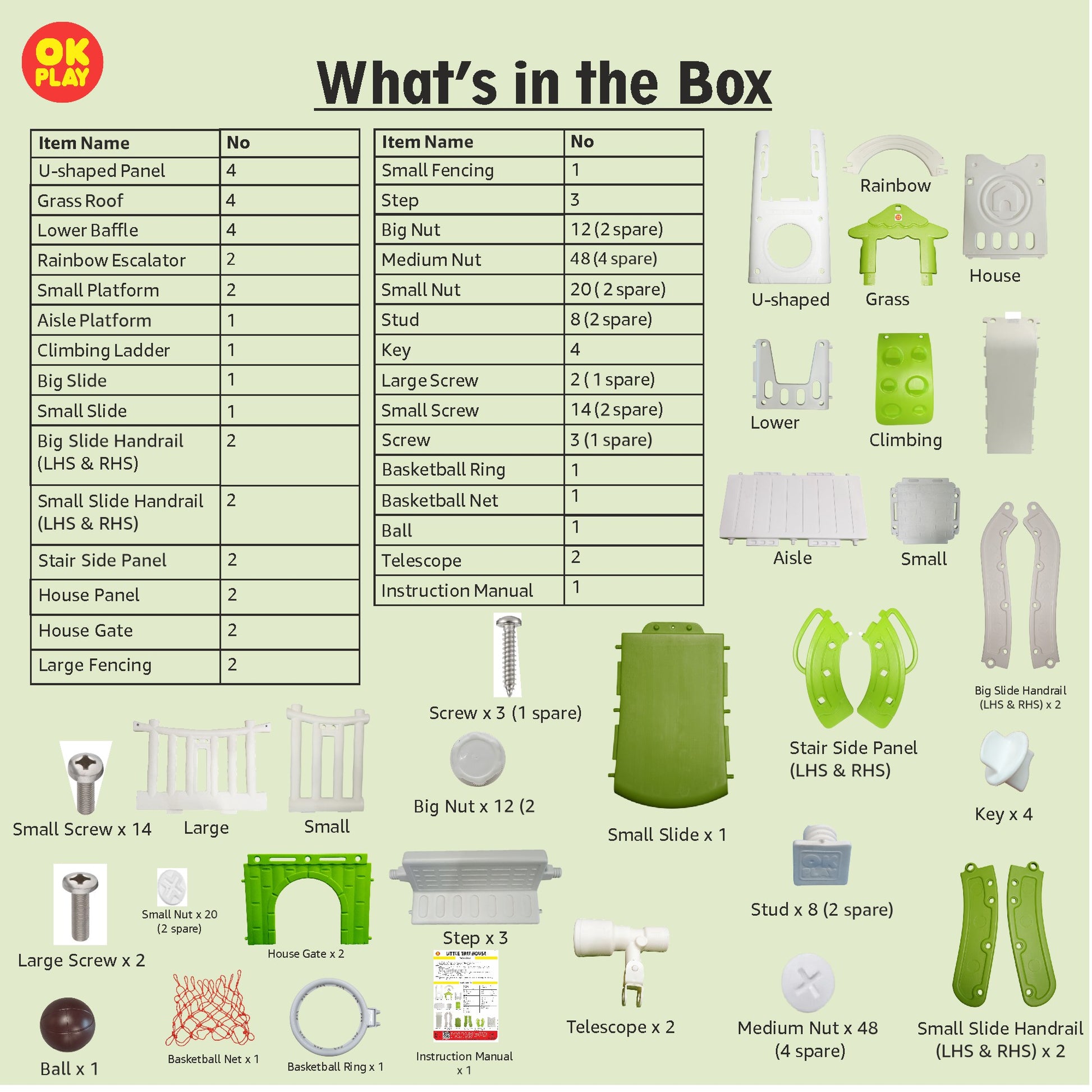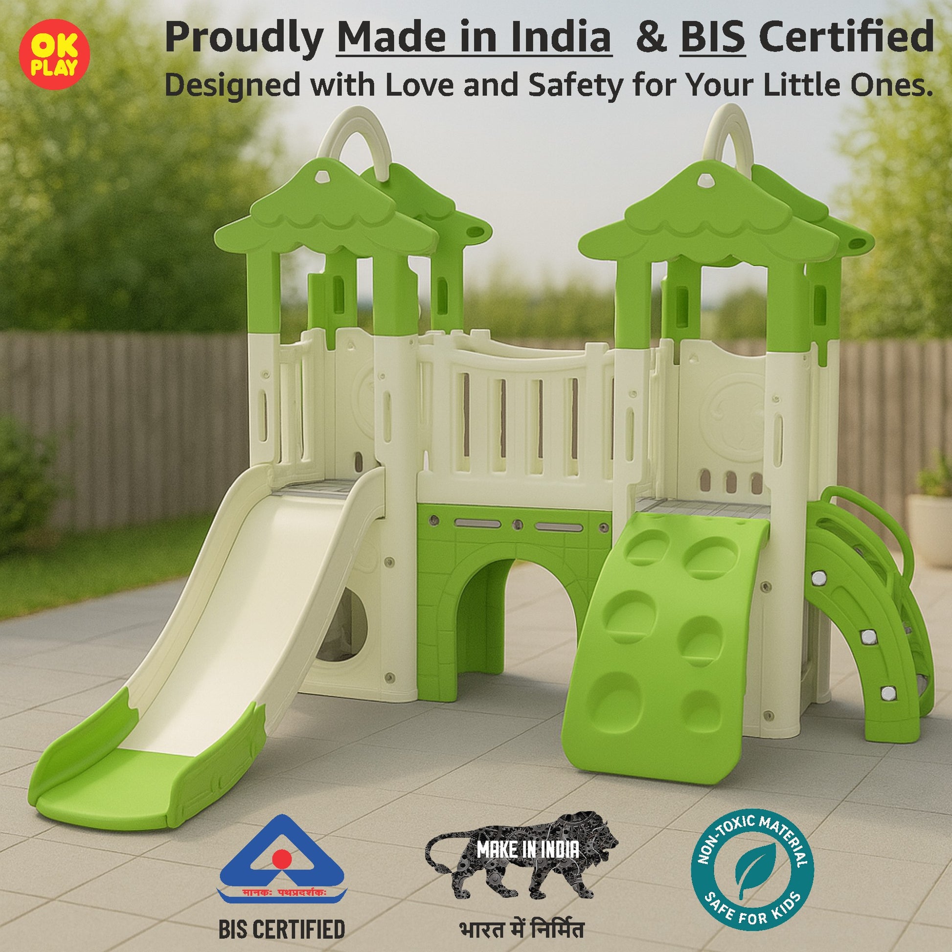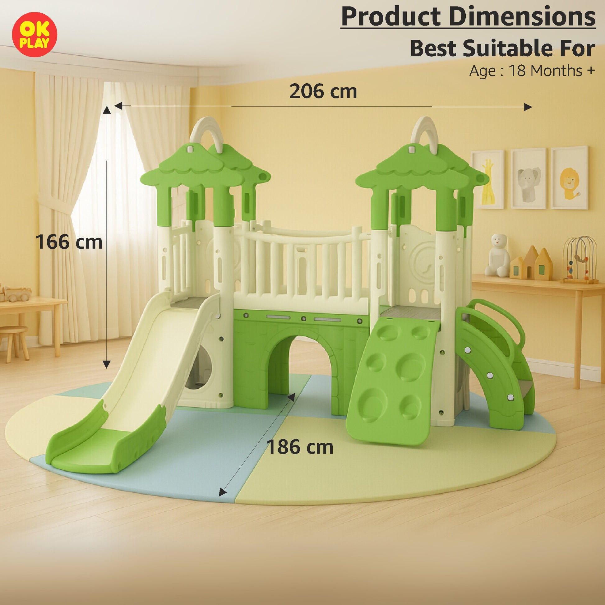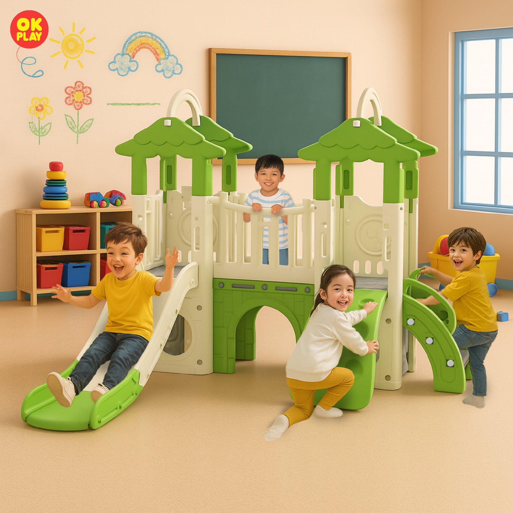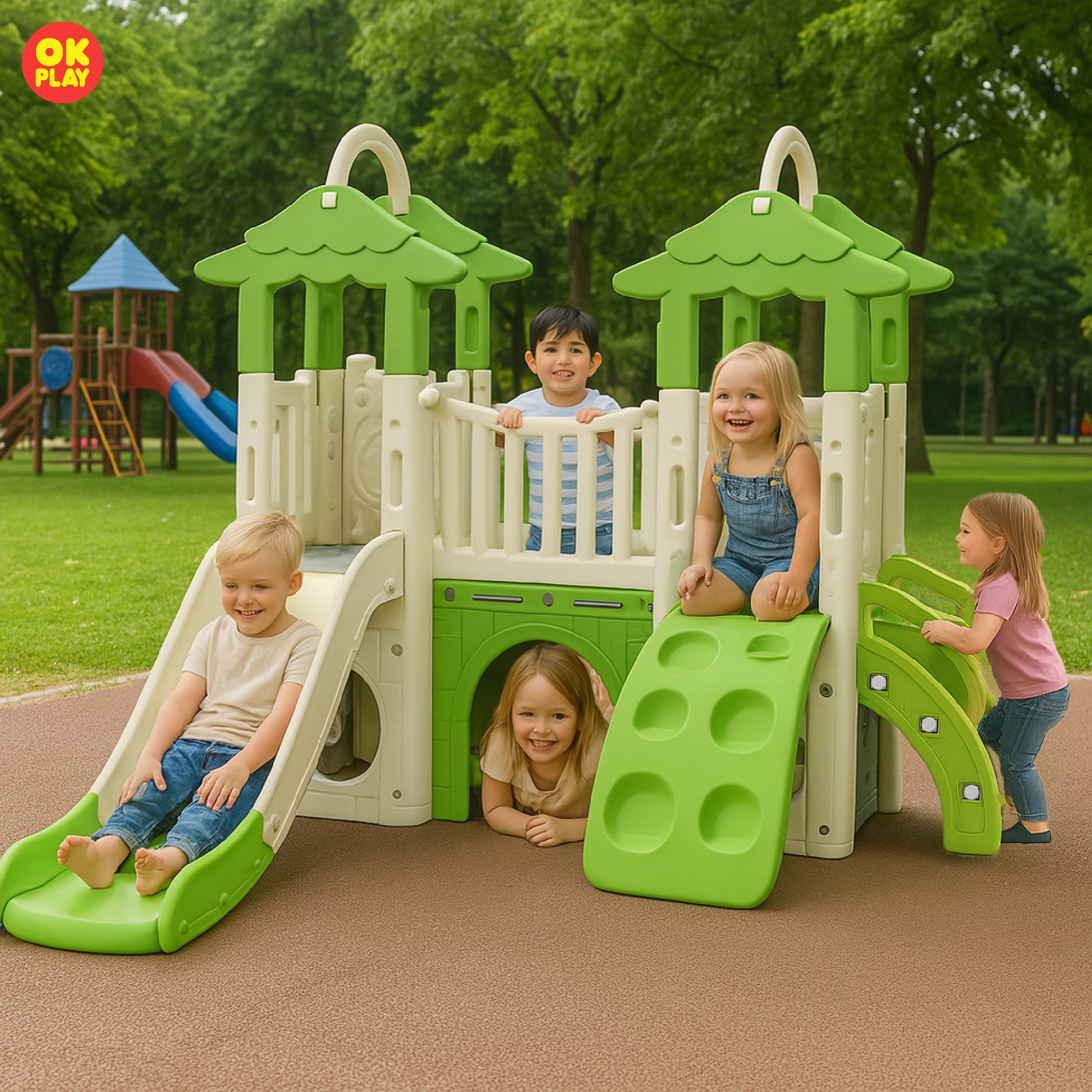 The OK PLAY Tree House is the ultimate adventure playset designed to spark imagination and keep kids engaged in active play. Featuring dual canopy-style towers, a smooth slide, a climbing wall, and a tunnel passage, this multi-activity playset offers endless fun while enhancing physical development. Made from high-quality, child-friendly plastic with smooth edges, it ensures safety and durability for long-lasting enjoyment. Whether indoors or outdoors, its sturdy design withstands all weather conditions, making it perfect for gardens, playrooms, schools, and daycare centers. It is easy to assemble and maintain, with a detailed instruction manual included for hassle-free setup. The OK PLAY Tree House encourages kids to climb, slide, and explore, promoting coordination, balance, and creativity in a fun-filled environment.