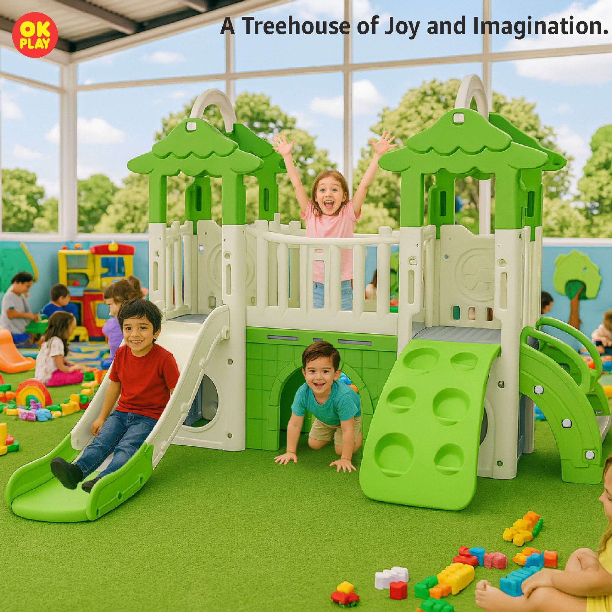 OK PLAY Little Tree House Playground Playset | with Slide, Climber, Basketball Hoop for Kids | Perfect for Home & School Modern Design | Indoor & Outdoor Use | Perfect Gift | Large