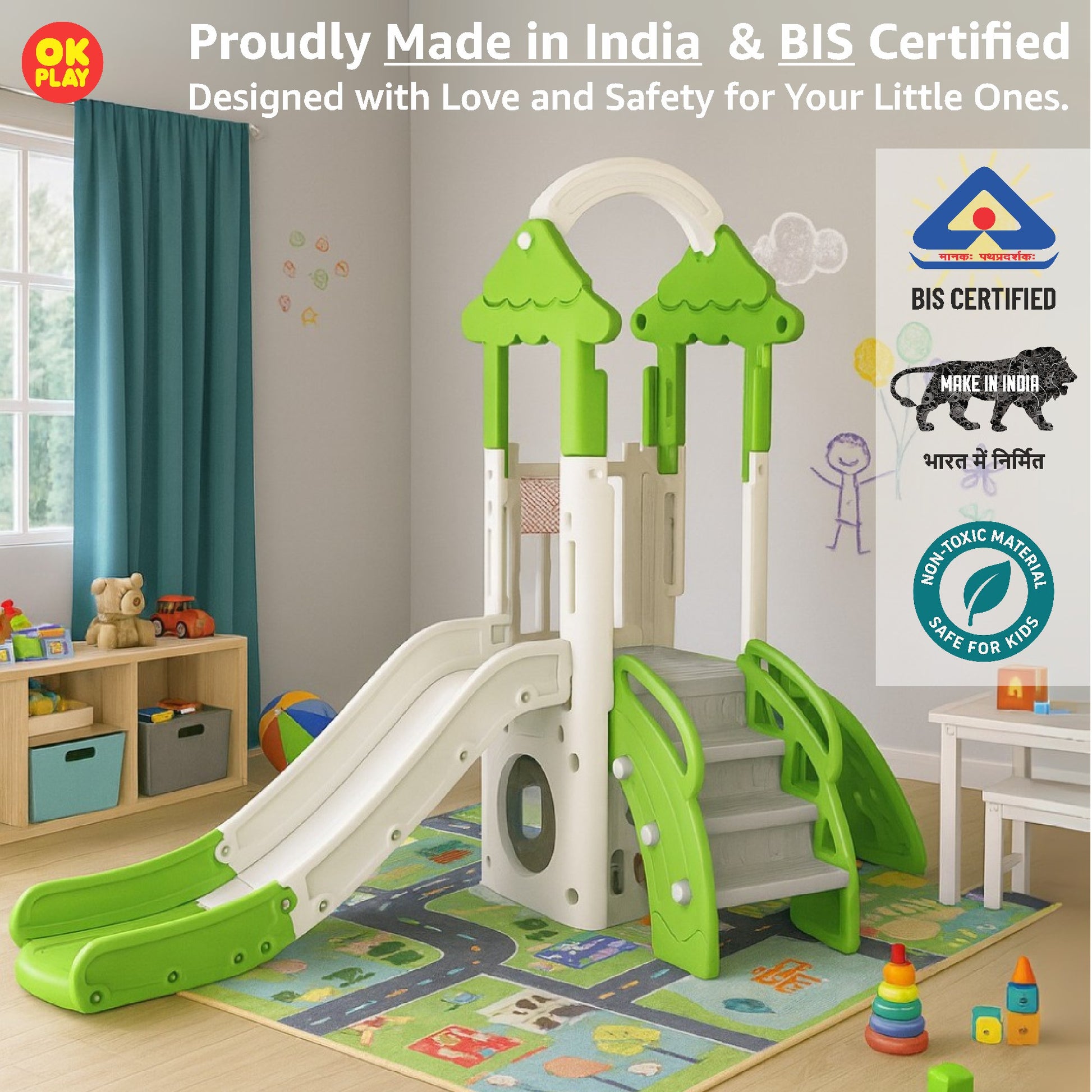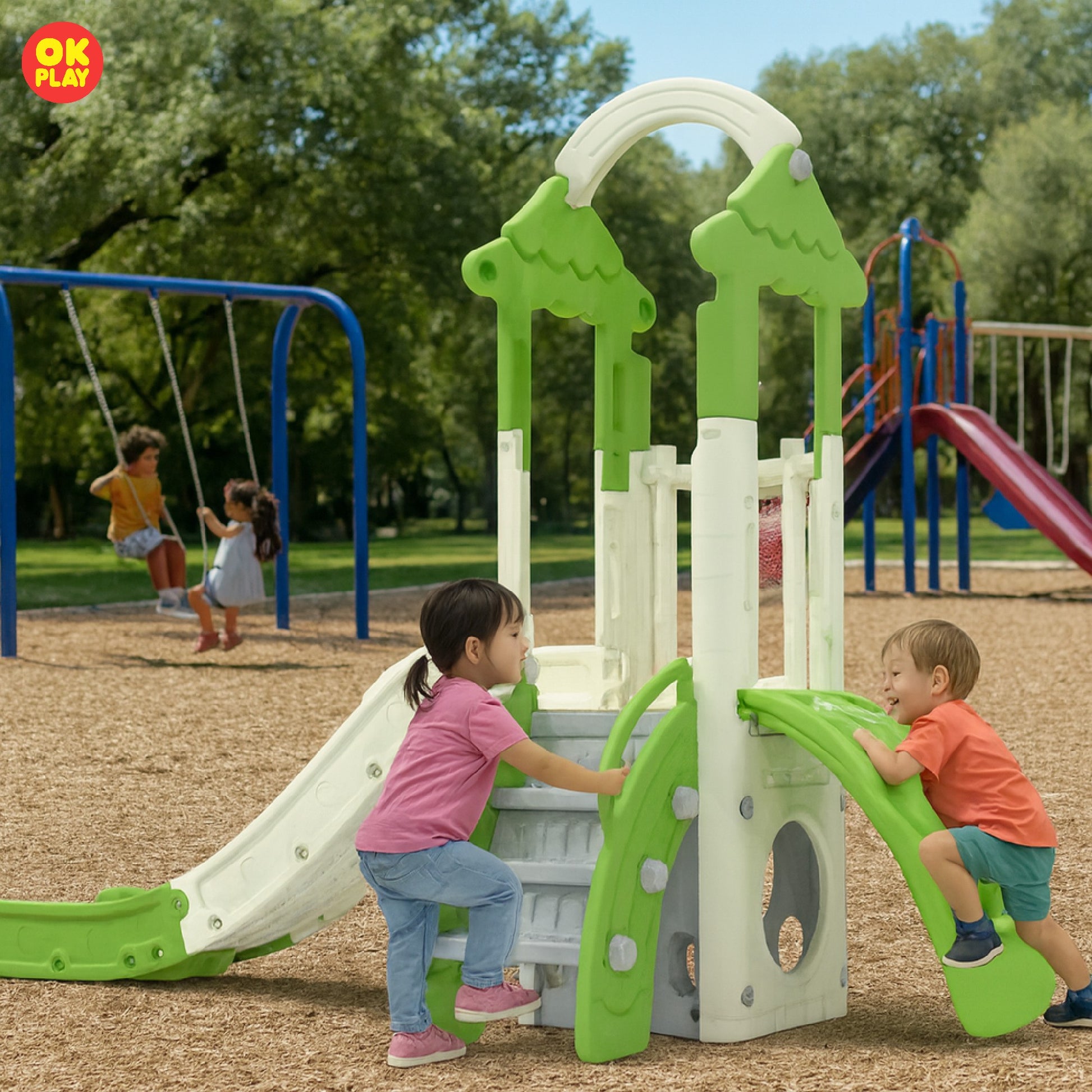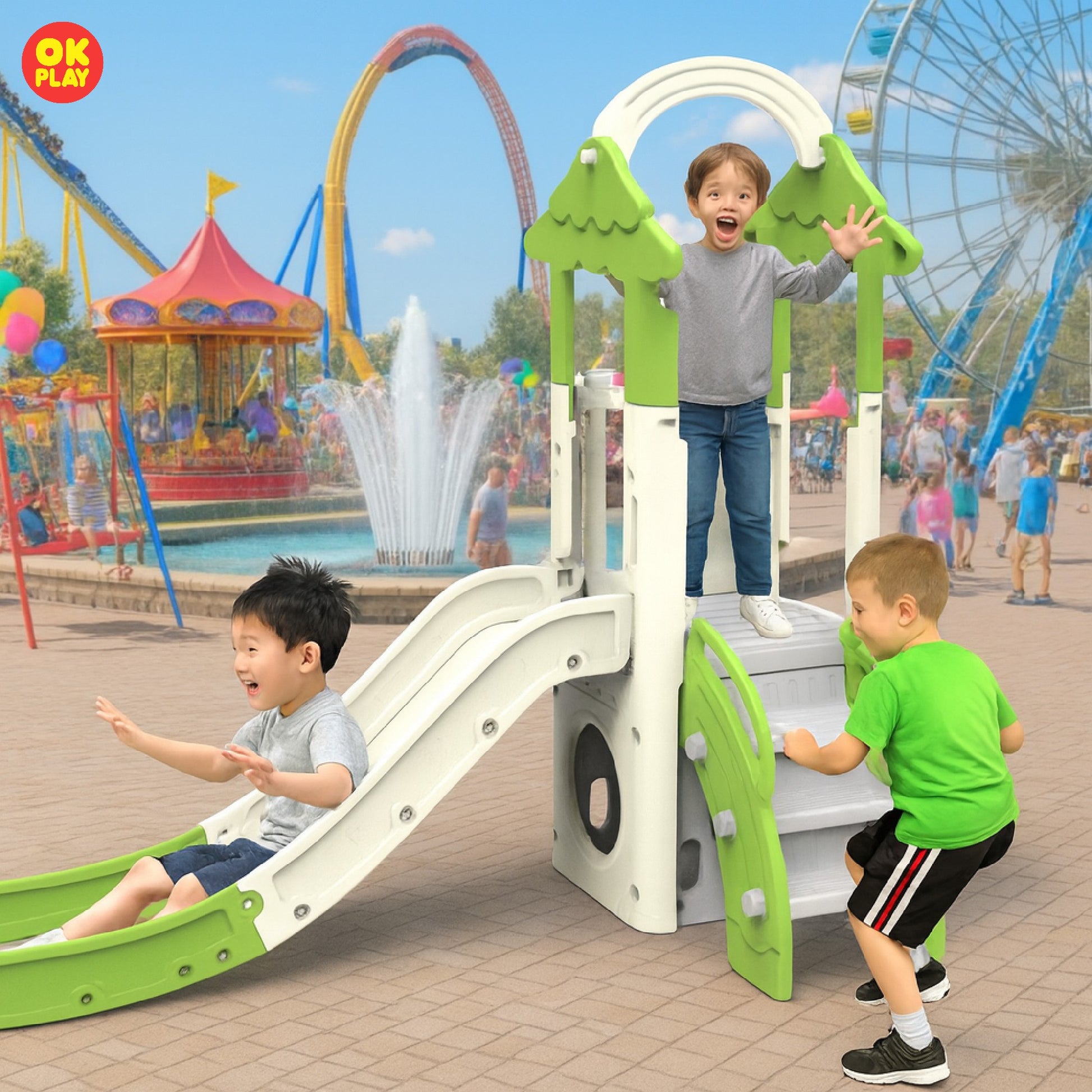 OK PLAY Little Tree House Playground Playset | with Slide & Basketball Hoop for Kids | Perfect for Home & School Safe & Modern Design | Indoor & Outdoor Use | Perfect Gift