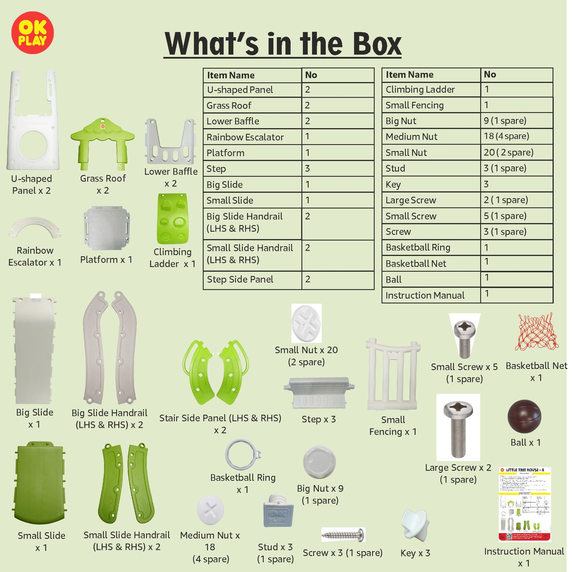 The OK PLAY Tree House is the ultimate adventure playset designed to spark imagination and keep kids engaged in active play. Featuring dual canopy-style towers, a smooth slide, a climbing wall, and a tunnel passage, this multi-activity playset offers endless fun while enhancing physical development. Made from high-quality, child-friendly plastic with smooth edges, it ensures safety and durability for long-lasting enjoyment. Whether indoors or outdoors, its sturdy design withstands all weather conditions, making it perfect for gardens, playrooms, schools, and daycare centers. It is easy to assemble and maintain, with a detailed instruction manual included for hassle-free setup. The OK PLAY Tree House encourages kids to climb, slide, and explore, promoting coordination, balance, and creativity in a fun-filled environment.