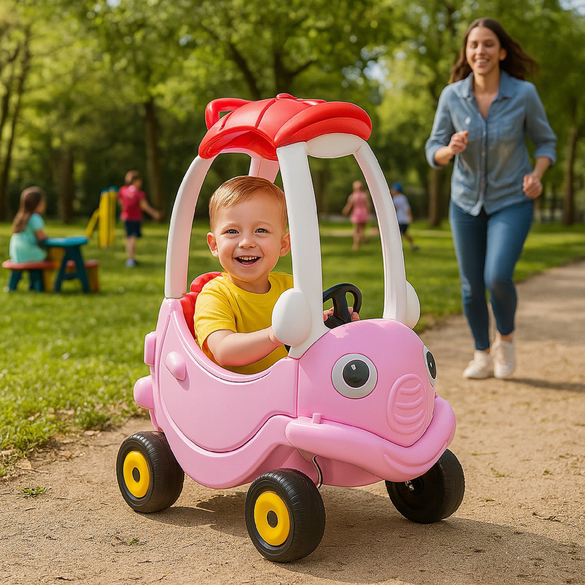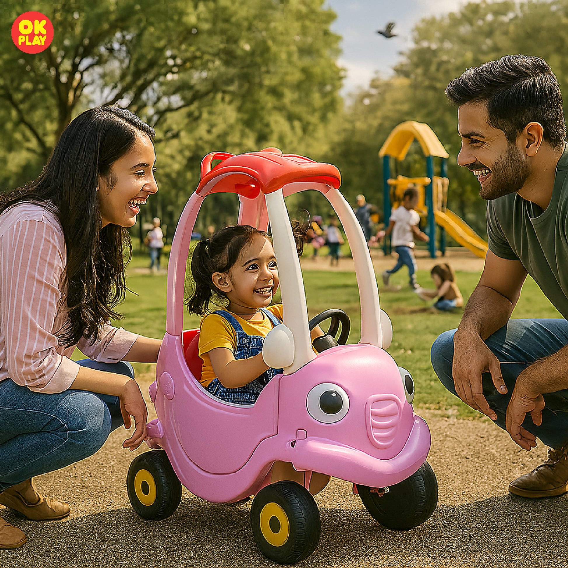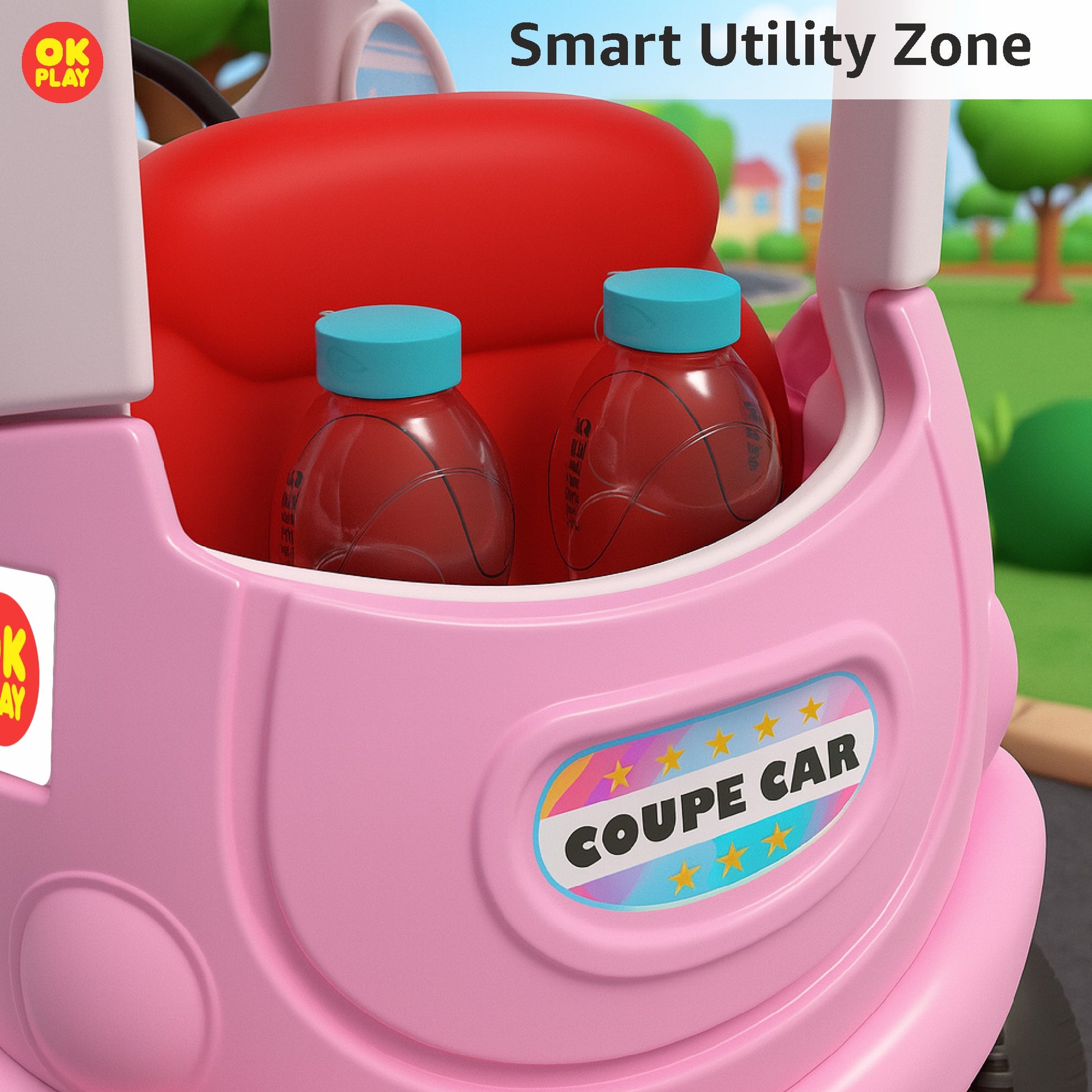 The OK PLAY Coupe Car is a fun and engaging ride-on designed for endless adventures. Made from durable, non-toxic plastic, it ensures a safe and sturdy experience for toddlers. Featuring smooth-rolling wheels, a 360° rotating steering wheel, and a horn, it offers an interactive and joyful ride. The spacious seat and back storage add extra convenience, allowing kids to carry their little essentials. It comes with a rear handle, enabling parents to push and guide their little ones with ease. Whether kids choose to push with their feet or enjoy a guided ride, it helps develop motor skills and coordination. Available in four vibrant colors – Blue, Yellow, Pink, and Orange, this coupe car is perfect for both indoor and outdoor play. Designed for easy assembly, it comes with a detailed instruction manual and an assembly video, making setup hassle-free.