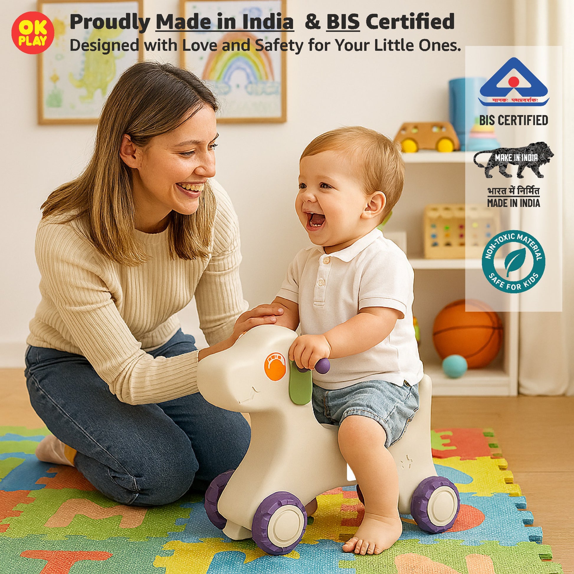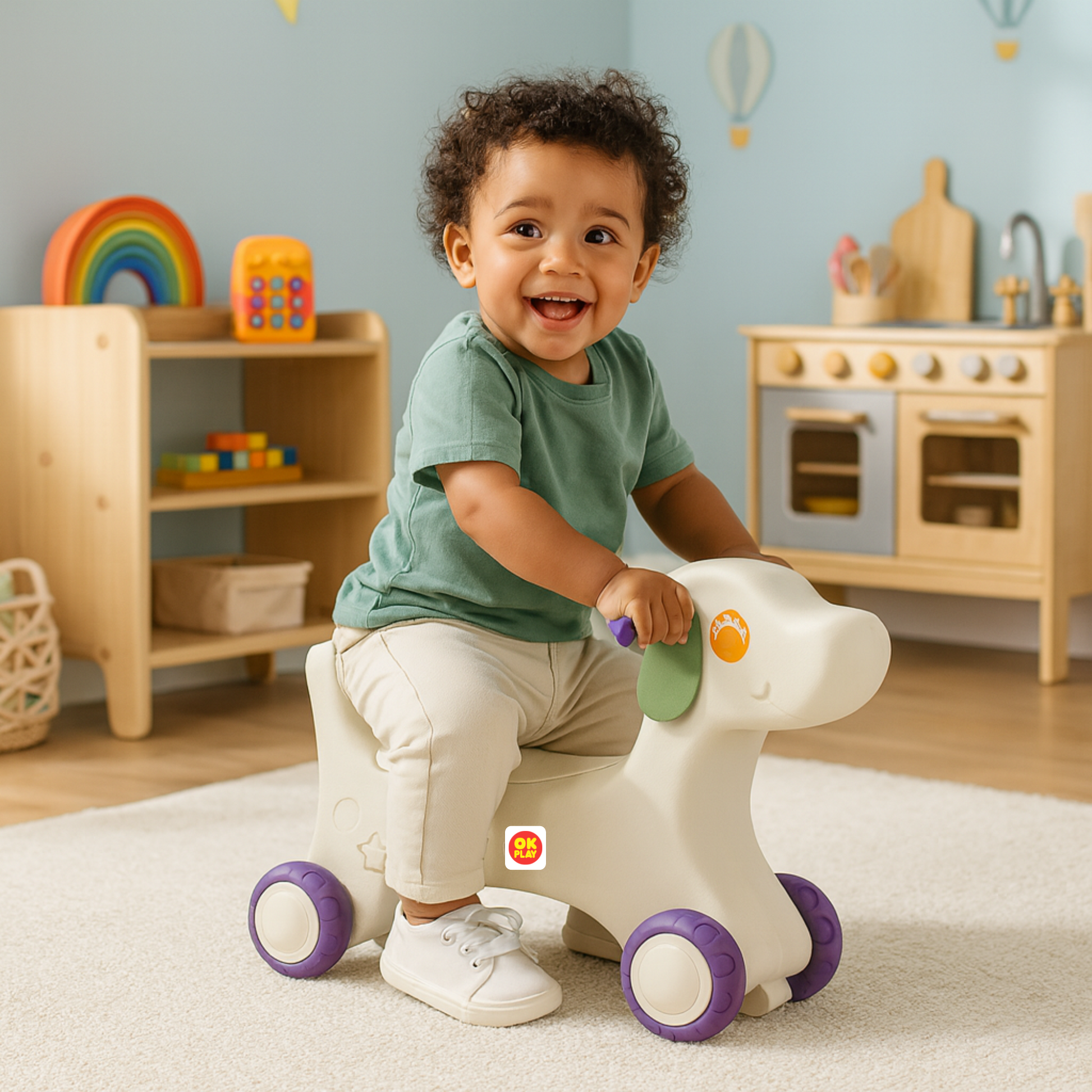 Cute & Playful Puppy Design – Shaped like a friendly puppy, this ride-on has a cheerful face, soft curved edges, and fun detailing, making it an instant favorite for toddlers.