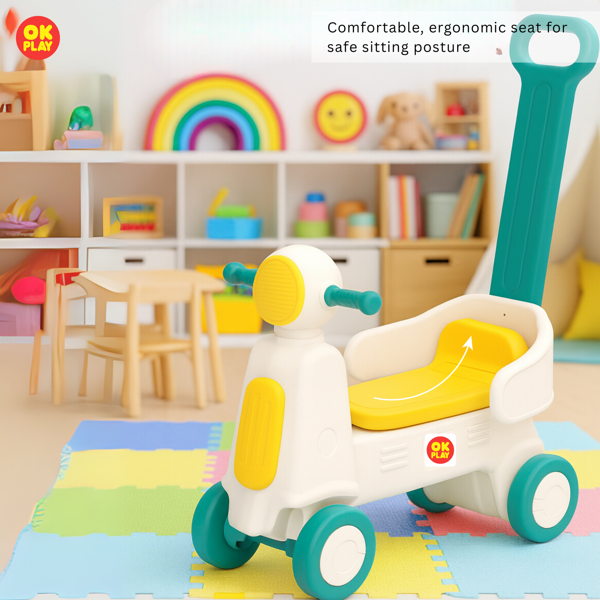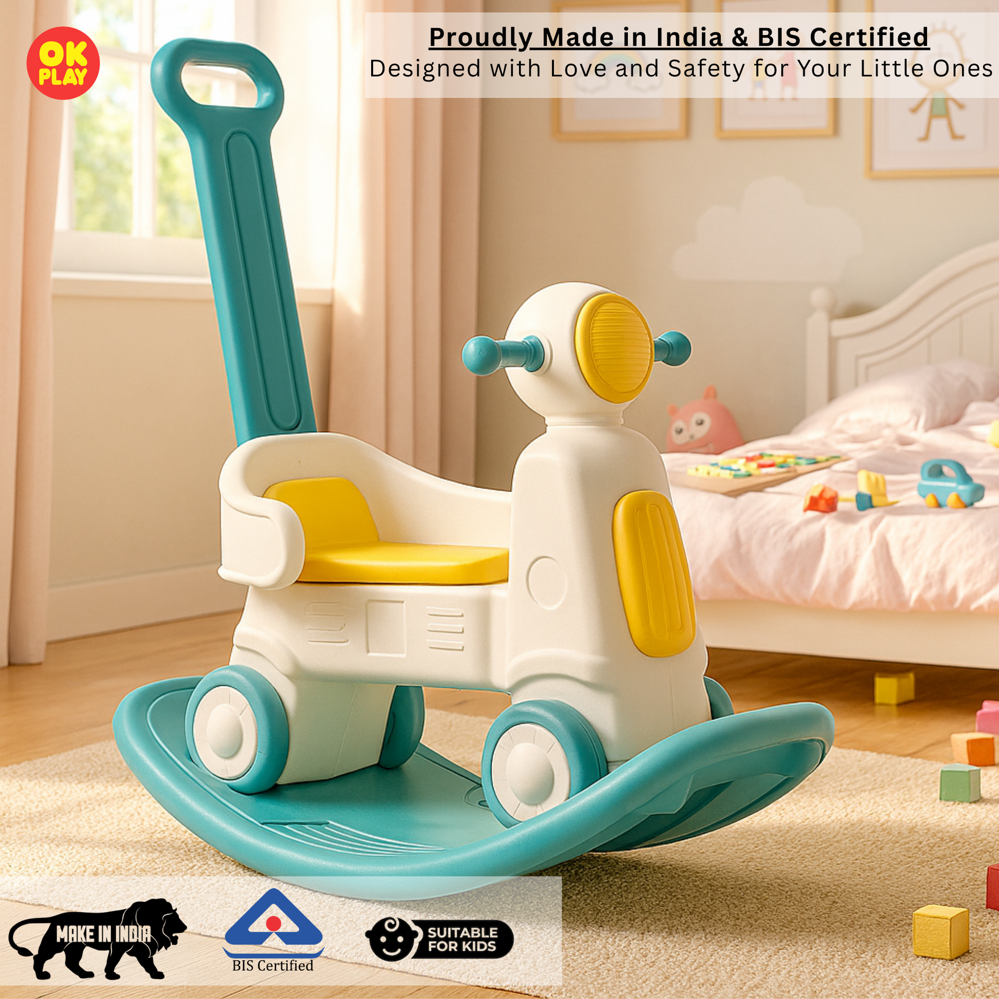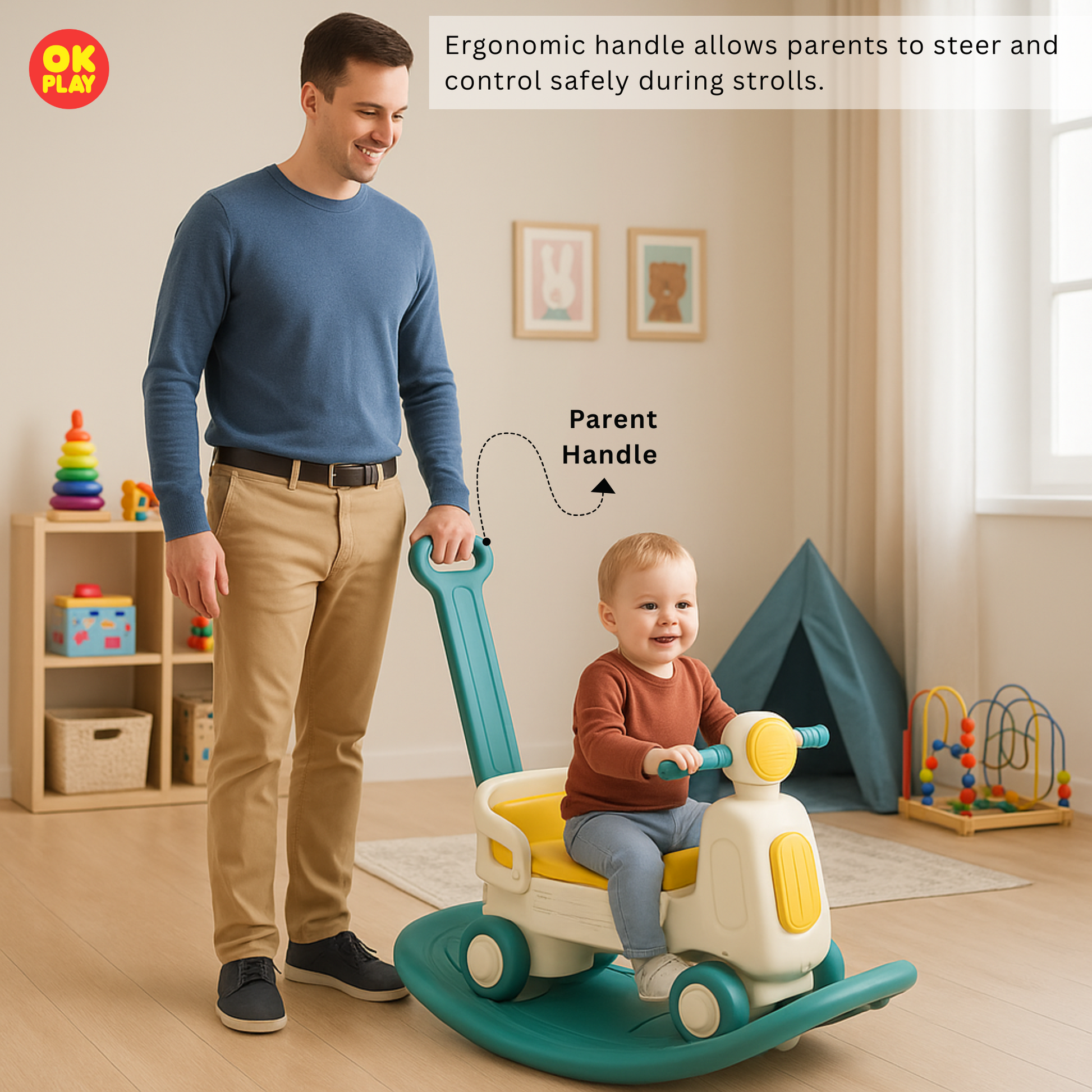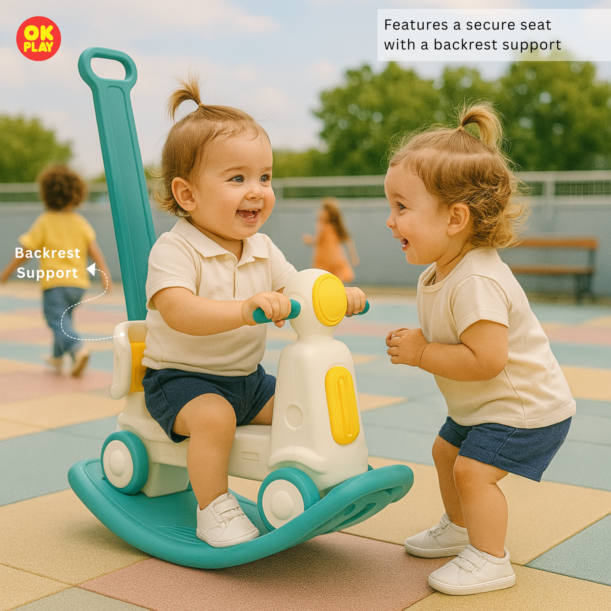 OK PLAY 3 in 1 Scooter Rocker Combo for Kids | Push On Ride On | Balancing Board | Backrest | Easy Grip | Anti Skid | Four Wheel | Indoor and Outdoor Play | Light-Weight | Perfect Gift