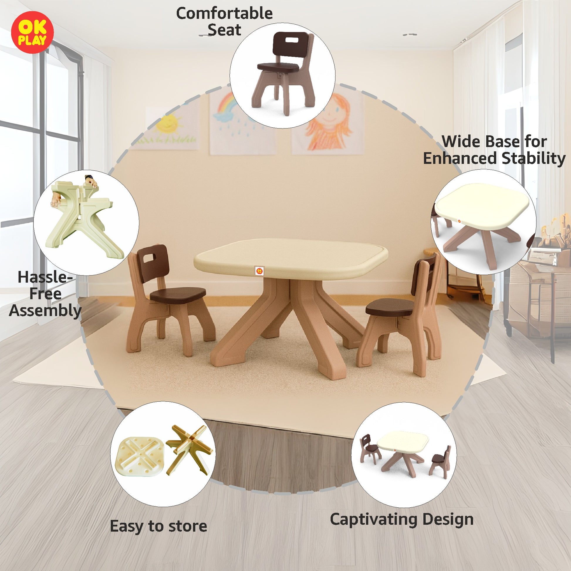 Give your little one a comfortable, safe, and engaging space to explore, learn, and play with the OK PLAY Table & Chair Set. Designed for kids aged 2 years and above, this set is ideal for studying, drawing, reading, and fun activities at home, school, or daycare.Made from premium-quality, durable, and non-toxic plastic, this set is designed with child-friendly, rounded edges for maximum safety. The ergonomically designed chairs provide proper back support, ensuring comfortable seating for long hours of use. The sturdy and spacious table offers plenty of room for multiple activities, fostering creativity and learning.Lightweight yet strong and stable, this set is easy to assemble, move, and store, making it ideal for both indoor and outdoor use. Its smooth surface makes cleaning effortless, ensuring a hygienic space for your child. Whether for study time, snack breaks, or playdates, the OK PLAY Table & Chair Set is a must-have addition to your child’s space, combining style, safety, and functionality.Let your child explore, learn, and grow with a versatile, durable, and thoughtfully designed table and chair set!